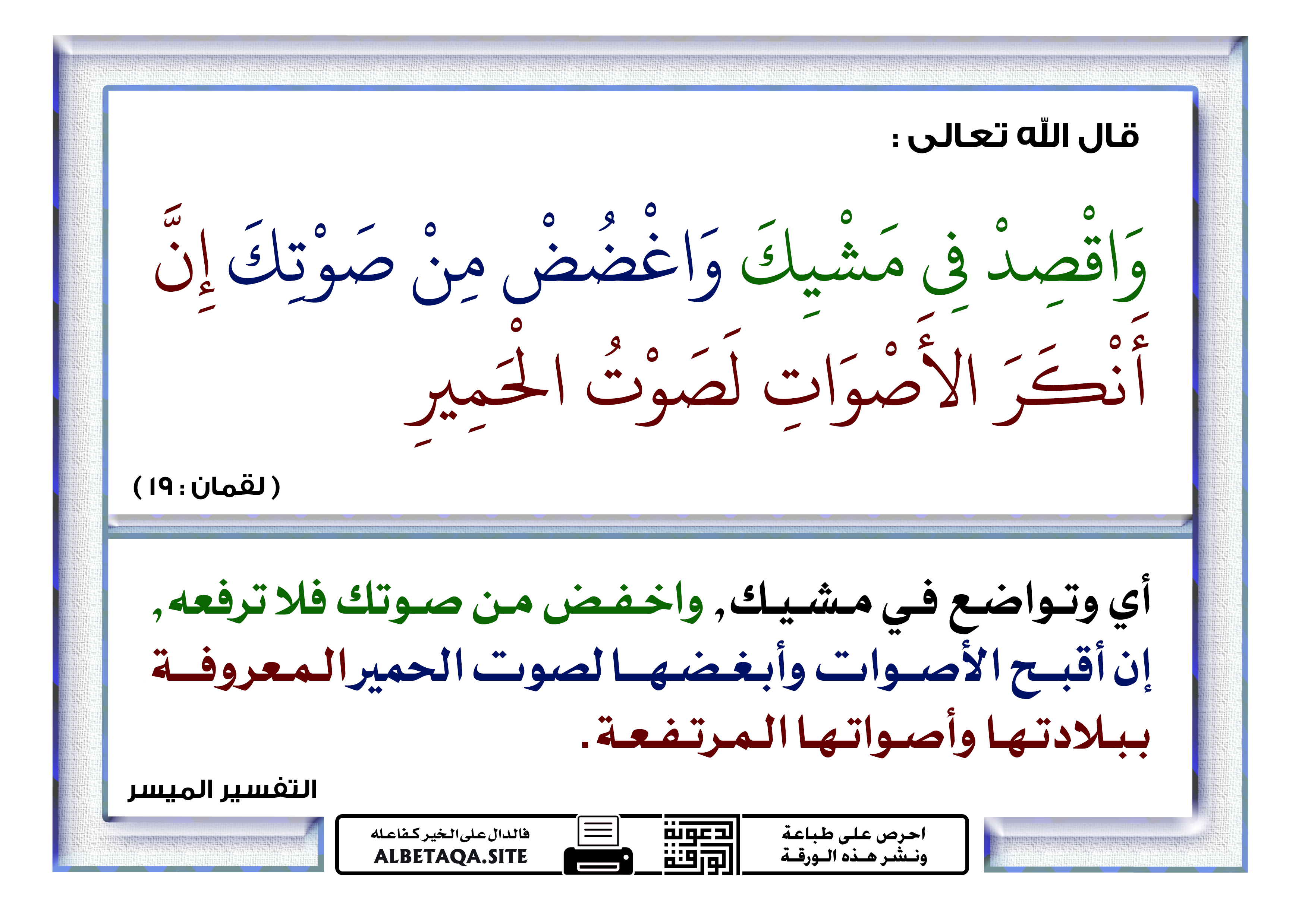 أي وتواضع في مشيك، واخفض من صوتك فلا ترفعه، إن أقبح الأصوات وأبغضها لصوت الحمير المعروفة ببلادتها وأصواتها المرتفعة. التفسير الميسر
