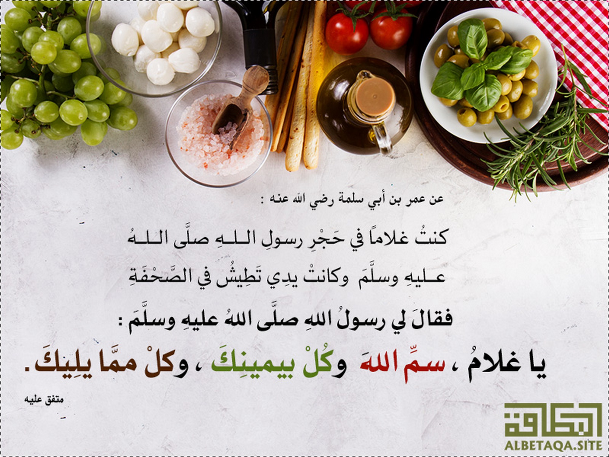 (كنت غلاما في حجر رسول الله صلى الله عليه وسلم، وكانت يدي تطيش في الصحفة، فقال لي رسول الله صلى الله عليه وسلم: يا غلام سم الله، وكل بيمينك، وكل مما يليك). متفق عليه