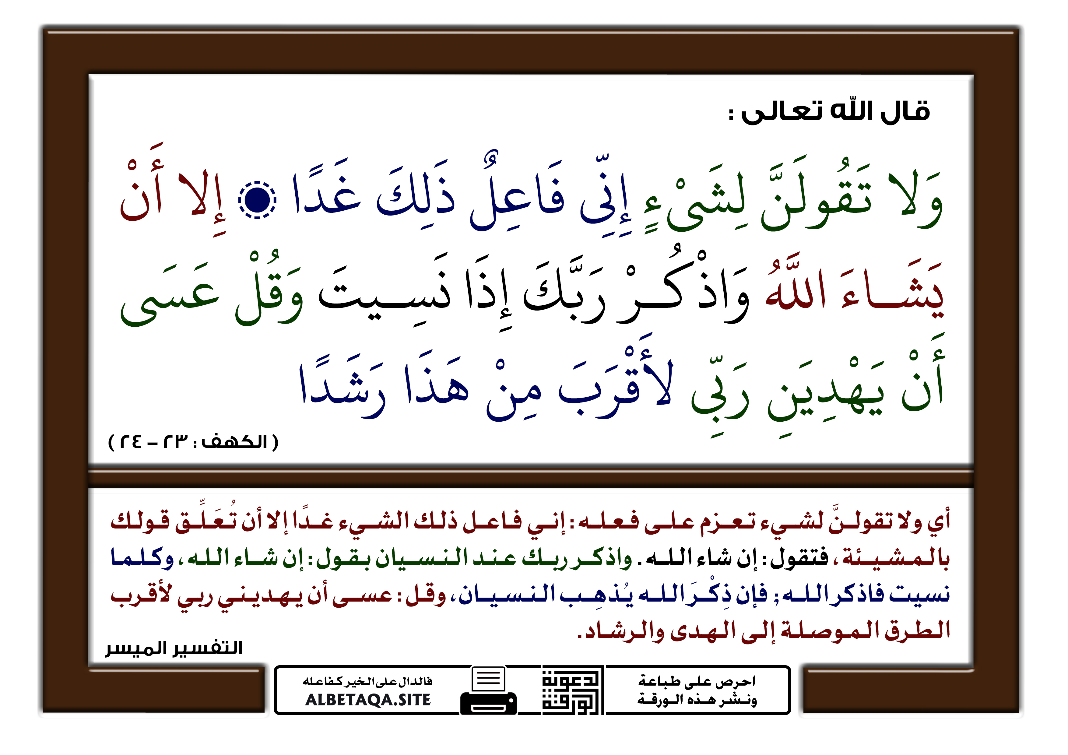 ولا تقولن لشيء إني فاعل ذلك غدا، إلا أن يشاء الله واذكر ربك إذا نسيت وقل عسى أن يهدين ربي لأقرب من هذا رشدا. (الكهف : 23 – 24)
