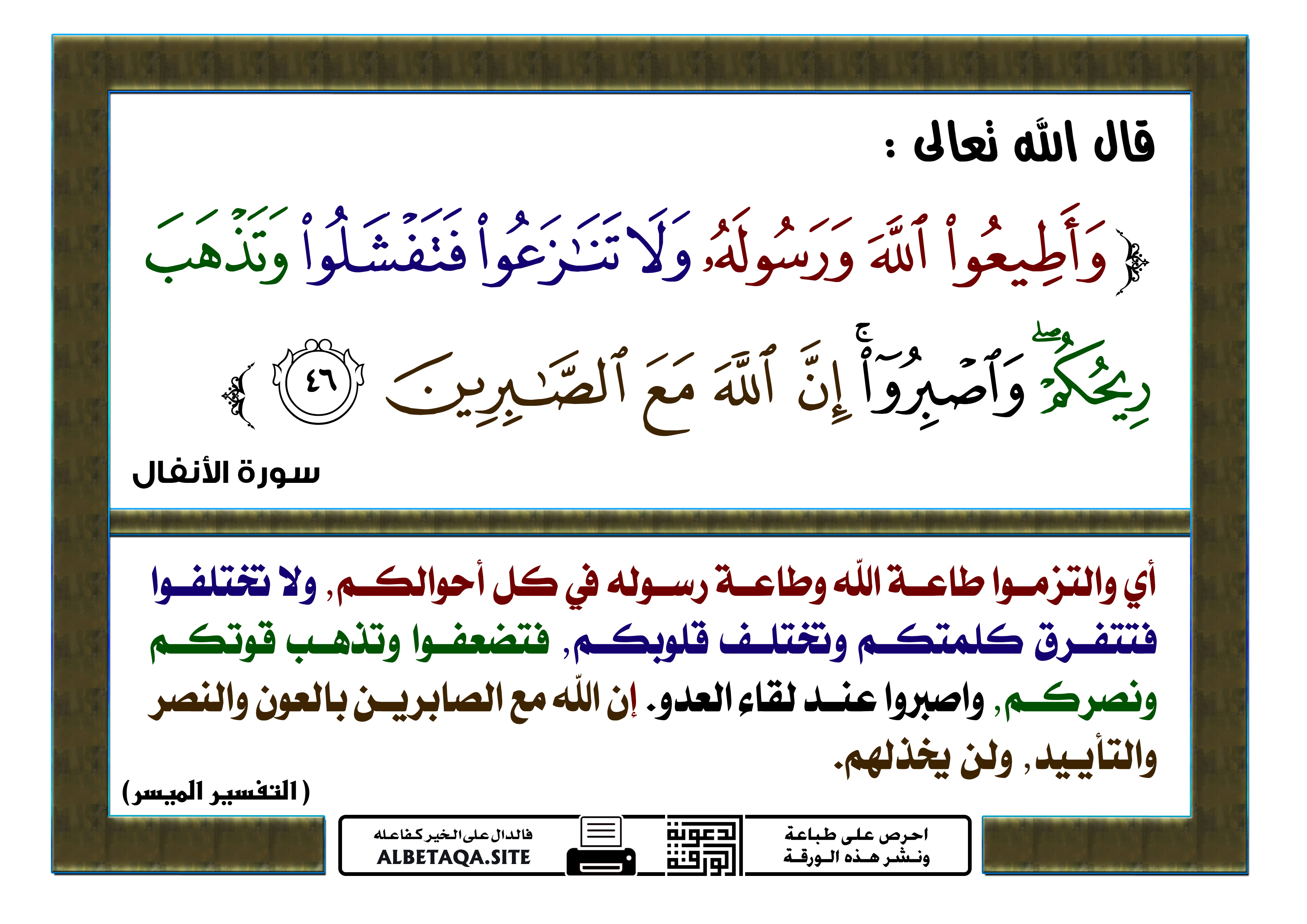 ”وأطيعوا الله ورسوله ولا تنازعوا فتفشلوا وتذهب ريحكم واصبروا إن الله مع الصابرين”. [الأنفال : 46]