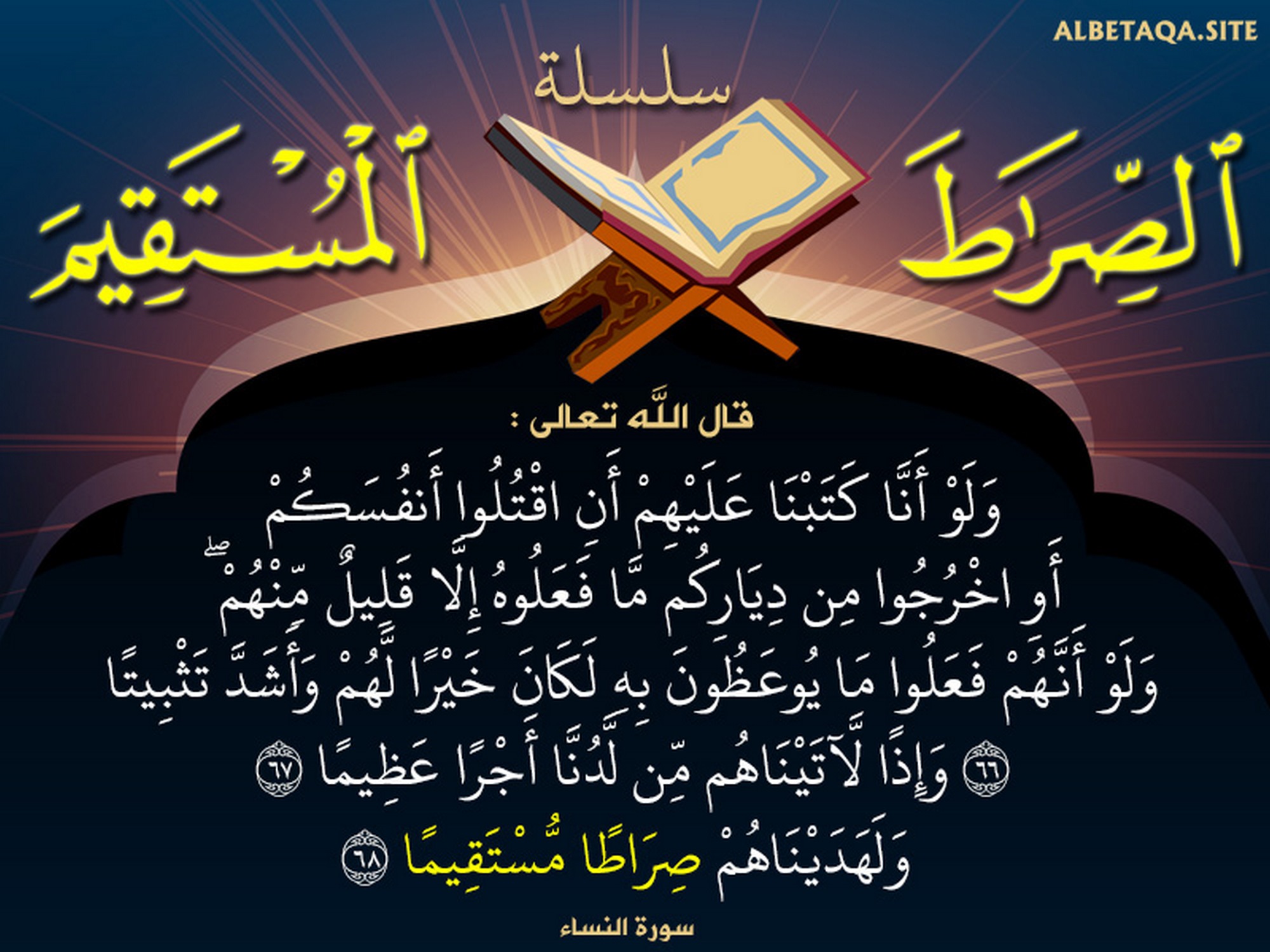 (ولو أنا كتبنا عليهم أن اقتلوا أنفسكم أو اخرجوا من دياركم ما فعلوه إلا قليل منهم ولو أنهم فعلوا ما يوعظون به لكان خيرا لهم وأشد تثبيتا (66) وإذا لآتيناهم من لدنا أجرا عظيما (67) ولهديناهم صراطا مستقيما(68)). سورة النساء