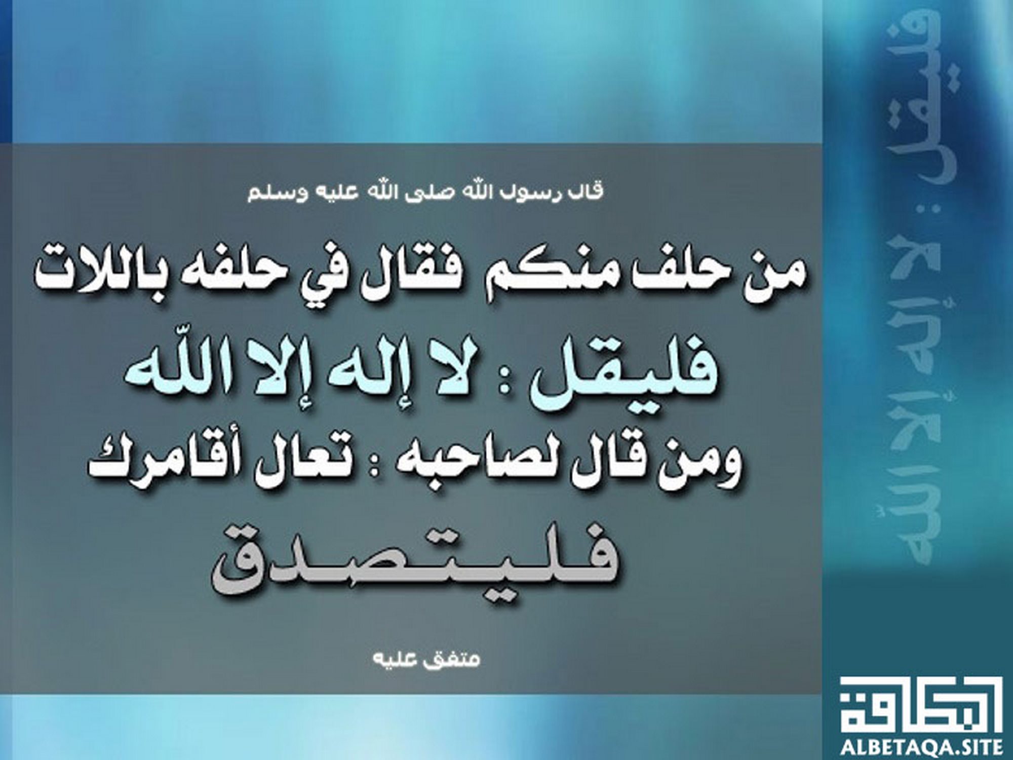 (من حلف منكم فقال في حلفه باللات فليقل: لا إله إلا الله ومن قال لصاحبه تعال أقامرك فليتصدق). متفق عليه