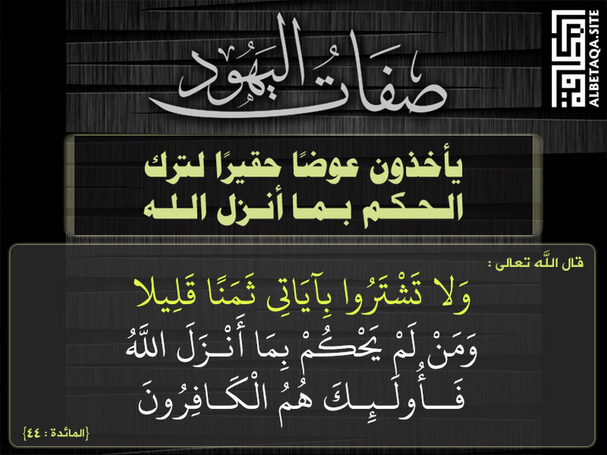 (ولا تشتروا بآياتي ثمنا قليلا ومن لم يحكم بما أنـزل الله فأولئك هم الكافرون). {المائدة : 44}