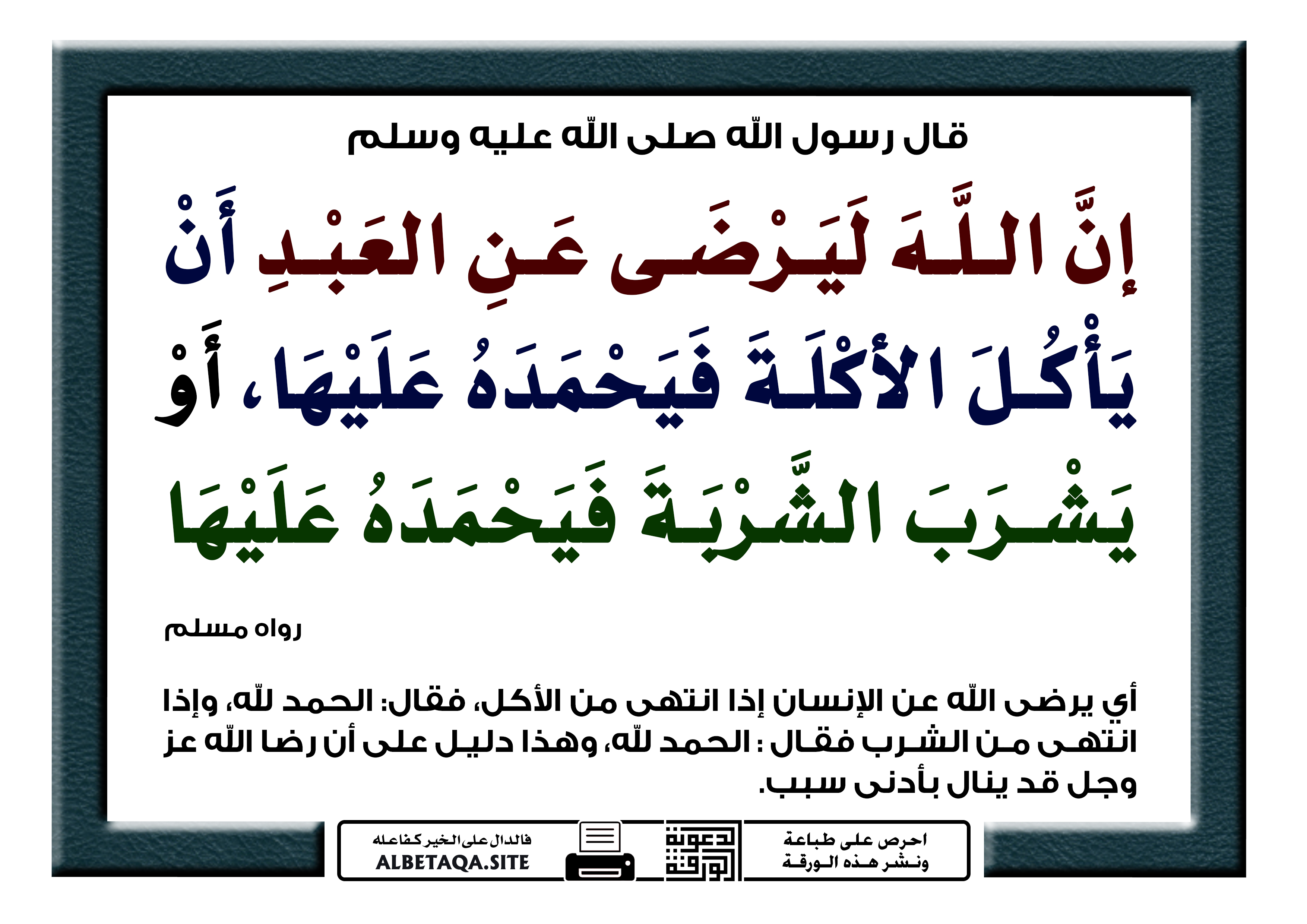 ((إن الله ليرضى عن العبد أن يأكل الأكلة فيحمده عليها، أو يشرب الشربة فيحمده عليها)). رواه مسلم