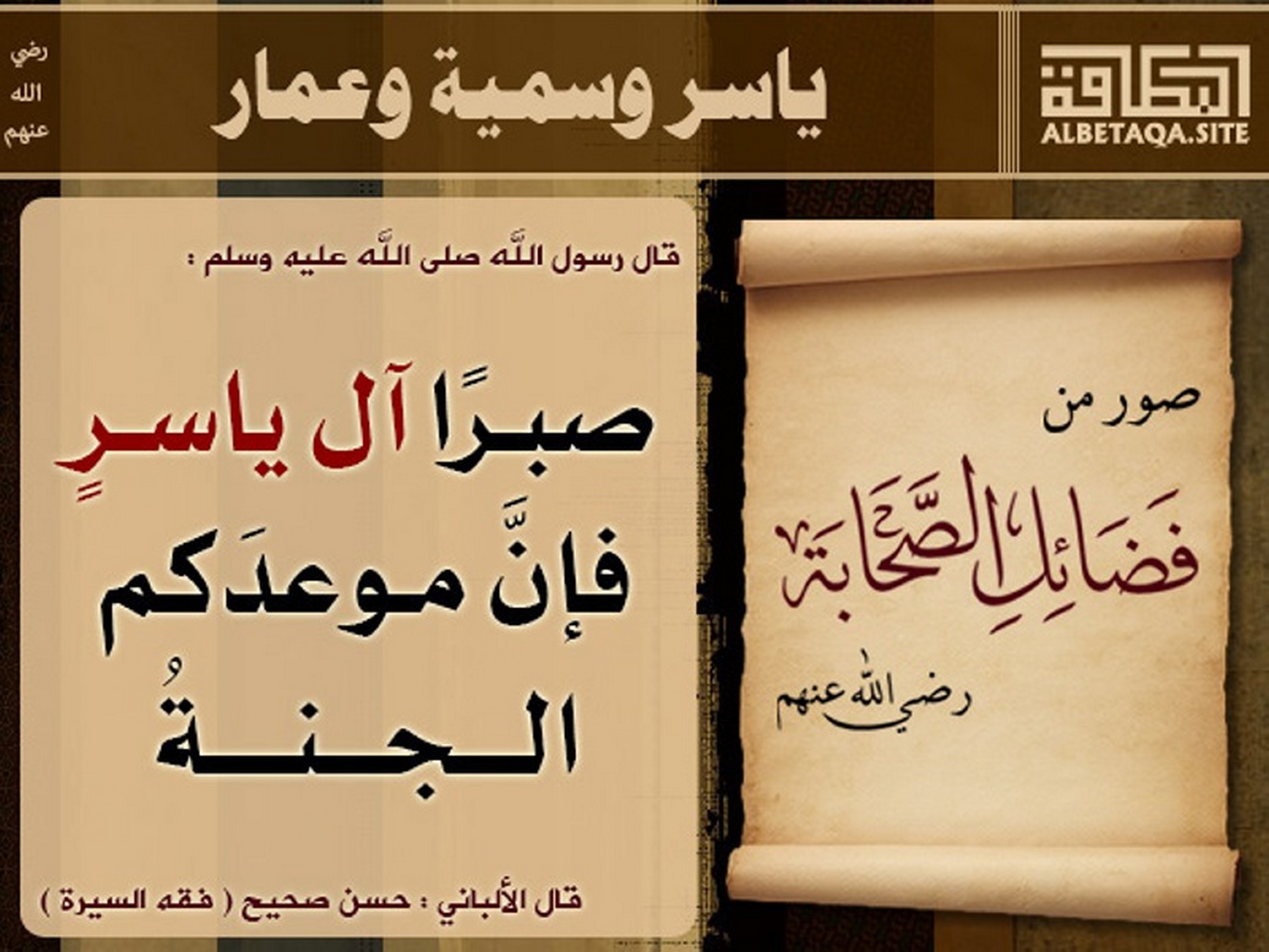 (صبرا آل ياسر، فإن موعدكم الجنة). قال الألباني: حسن صحيح (فقه السيرة)