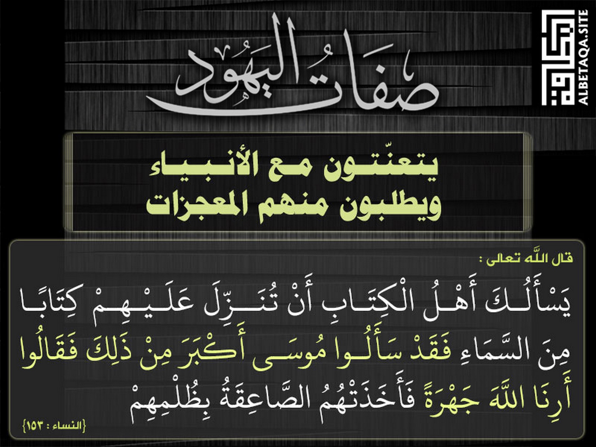 (يسألك أهل الكتاب أن تنـزل عليهم كتابا من السماء فقد سألوا موسى أكبر من ذلك فقالوا أرنا الله جهرة فأخذتهم الصاعقة بظلمهم). {النساء: 153}