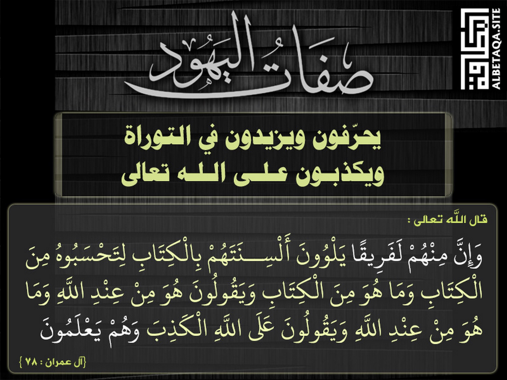 (وإن منهم لفريقا يلوون ألسنتهم بالكتاب لتحسبوه من الكتاب وما هو من الكتاب ويقولون هو من عند الله وما هو من عند الله ويقولون على الله الكذب وهم يعلمون). {آل عمران: 78}