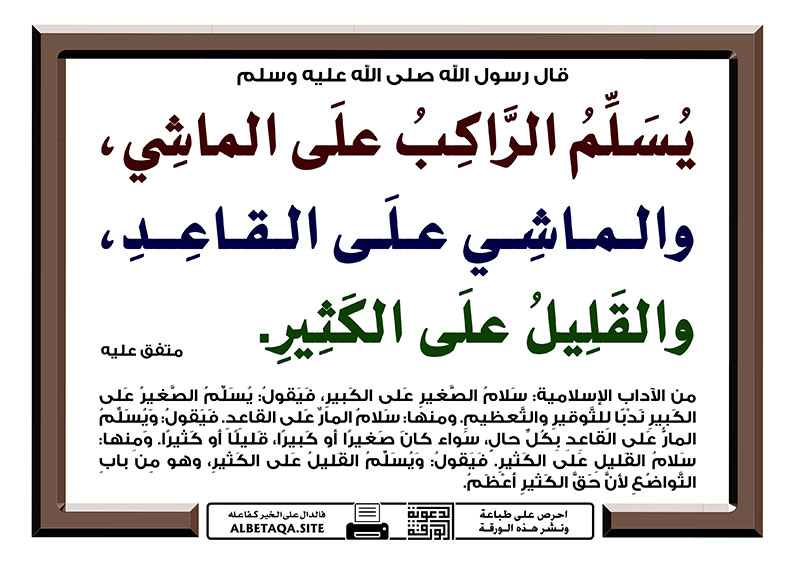 (يسلم الراكب على الماشي، والماشي على القاعد، والقليل على الكثير). متفق عليه