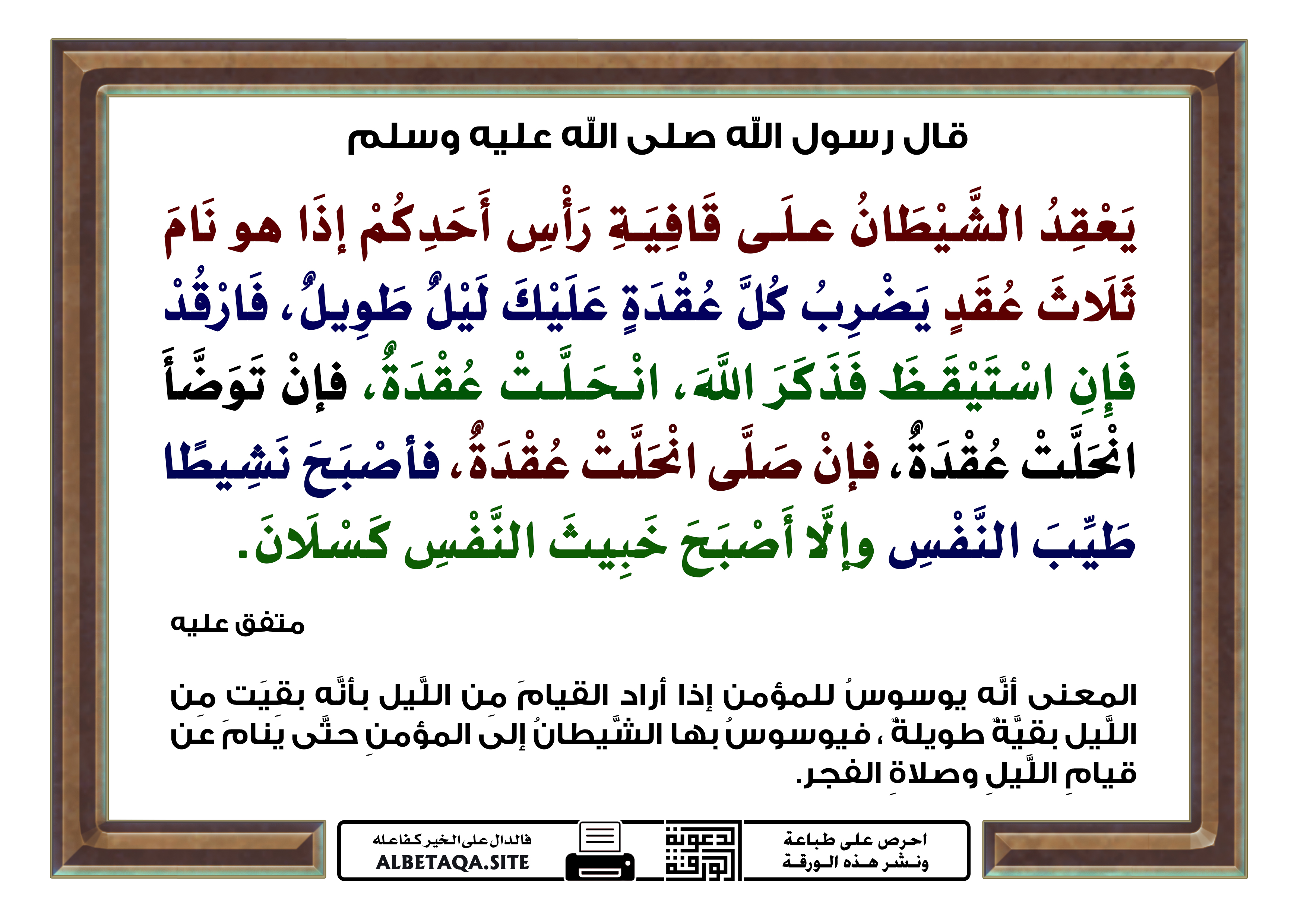 (يعقد الشيطان على قافية رأس أحدكم إذا هو نام ثلاث عقد يضرب كل عقدة عليك ليل طويل، فارقد فإن استيقظ فذكر الله، انحلت عقدة، فإن توضأ انحلت عقدة، فإن صلى انحلت عقدة، فأصبح نشيطا طيب النفس وإلا أصبح خبيث النفس كسلان). متفق عليه