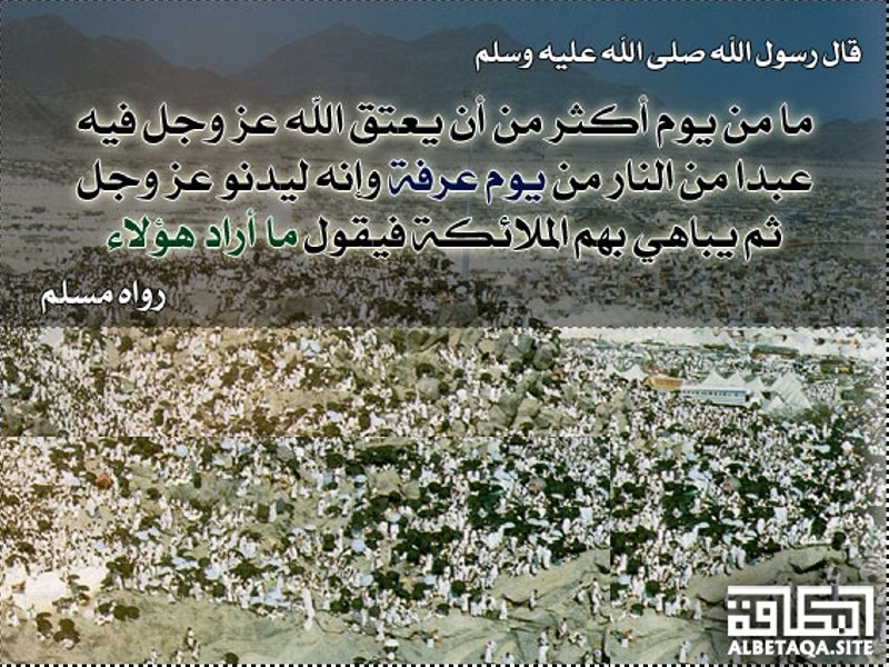 (مامن يوم أكثر من أن يعتق الله عز وجل فيه عبدا من النار من يوم عرفة وإنه ليدنو عز وجل ثم يباهي بهم الملائكة فيقول ما أراد هؤلاء). رواه مسلم