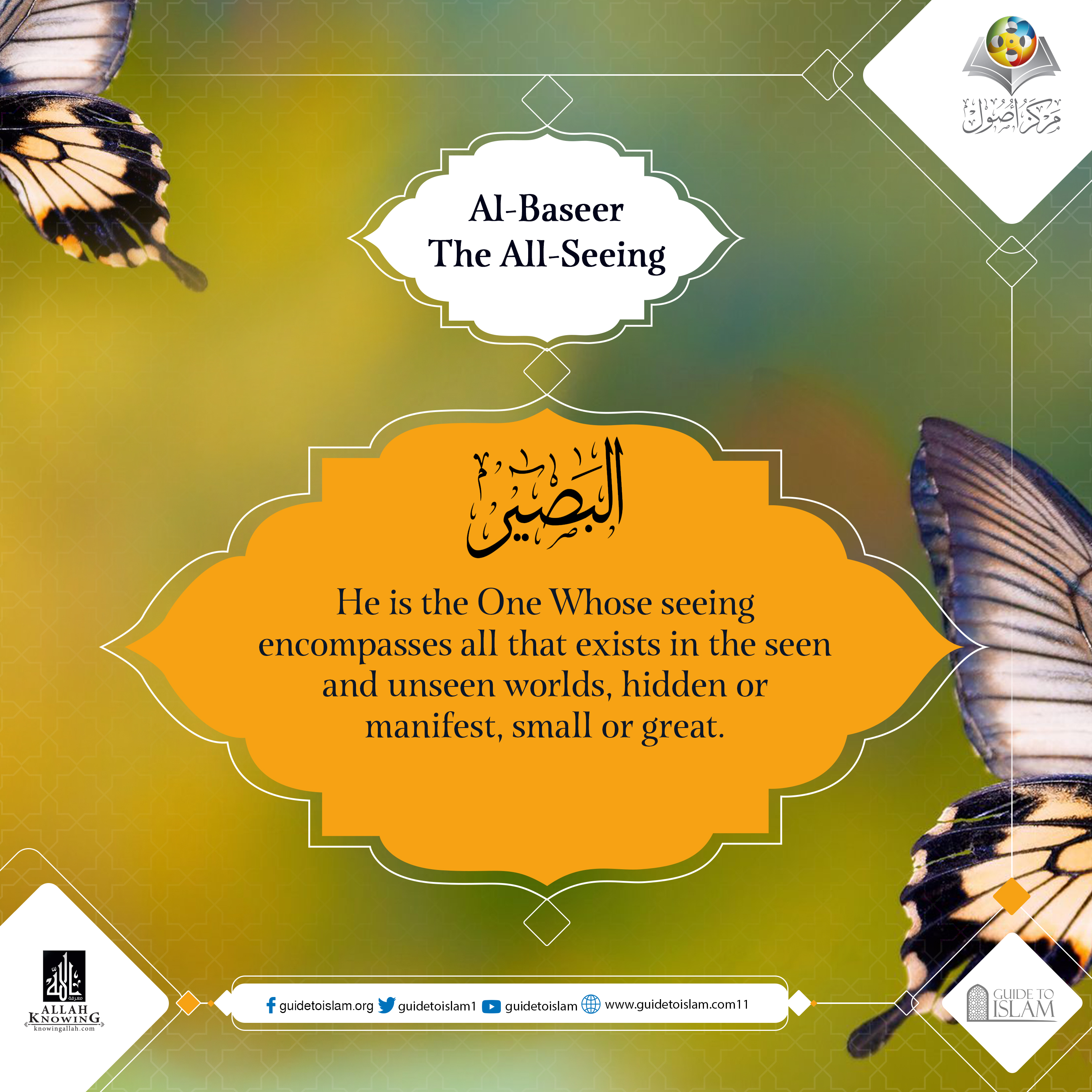 Al-Baseer: The All-Seeing, He is the One Whose seeing encompasses all that exists in the seen and unseen worlds, hidden or manifest, small or great.