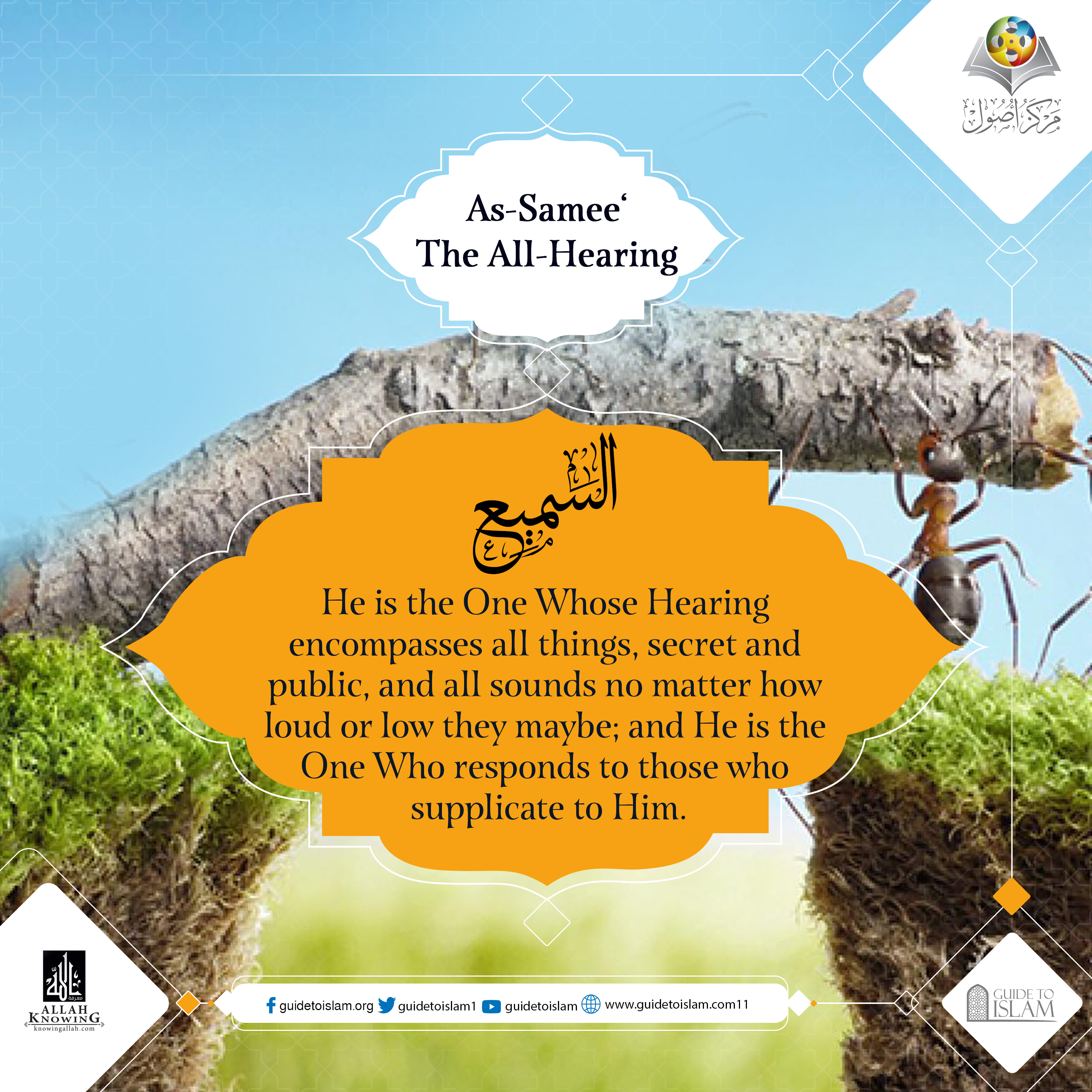 As-Samee': The All-Hearing, He is the One Whose Hearing encompasses all things, secret and public, and all sounds no matter how loud or low they maybe; and He is the One Who responds to those who supplicate to Him.