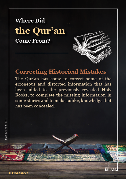 The Qur’an has come to correct some of the erroneous and distorted information that has been added to the previously revealed Holy Books, to complete the missing information in some stories and to make public, knowledge that has been concealed.