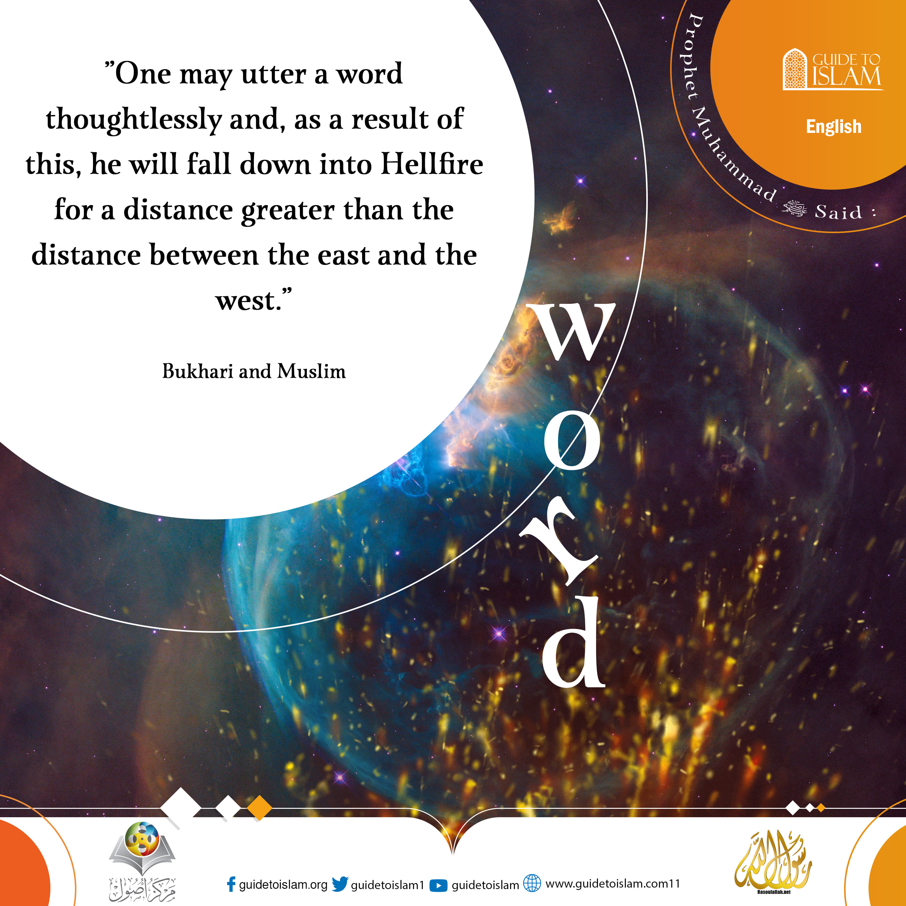 Abu Hurayrah (may Allah be pleased with him) reported that the Prophet (may Allah's peace and blessings be upon him) said: "One may utter a word thoughtlessly and, as a result of this, he will fall down into Hellfire for a distance greater than the distance between the east and the west." [Bukhari and Muslim].
