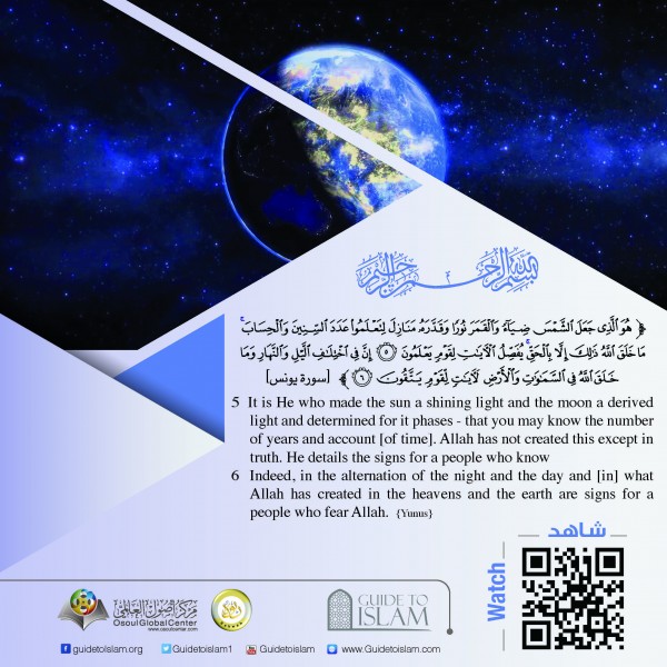 هُوَ الَّذِي جَعَلَ الشَّمْسَ ضِيَاءً وَالْقَمَرَ نُورًا وَقَدَّرَهُ مَنَازِلَ لِتَعْلَمُوا عَدَدَ السِّنِينَ وَالْحِسَابَ مَا خَلَقَ اللَّهُ ذَلِكَ إِلا بِالْحَقِّ يُفَصِّلُ الآيَاتِ لِقَوْمٍ يَعْلَمُونَ