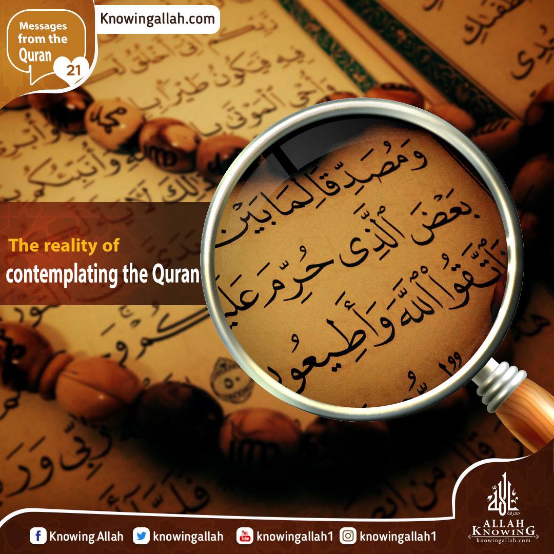 Contemplating the Quran is an internal psychological movement! It considers the issue of self in terms of time and place, for two possibilities: the first possibility of following the Quran and surrender to its rulings and guidance. The second possibility: is the contrary, which is rebellion, arrogance and disobedience! In both cases, the contemplator looks at the fate of a possible case! That is the reflection! Therefore, it is a considering the outcome of the accidents and their consequences, and links between the reasons and their causes, in the cases that already occurred and that which are likely to occur, at the psychological and social level. In both good and evil!