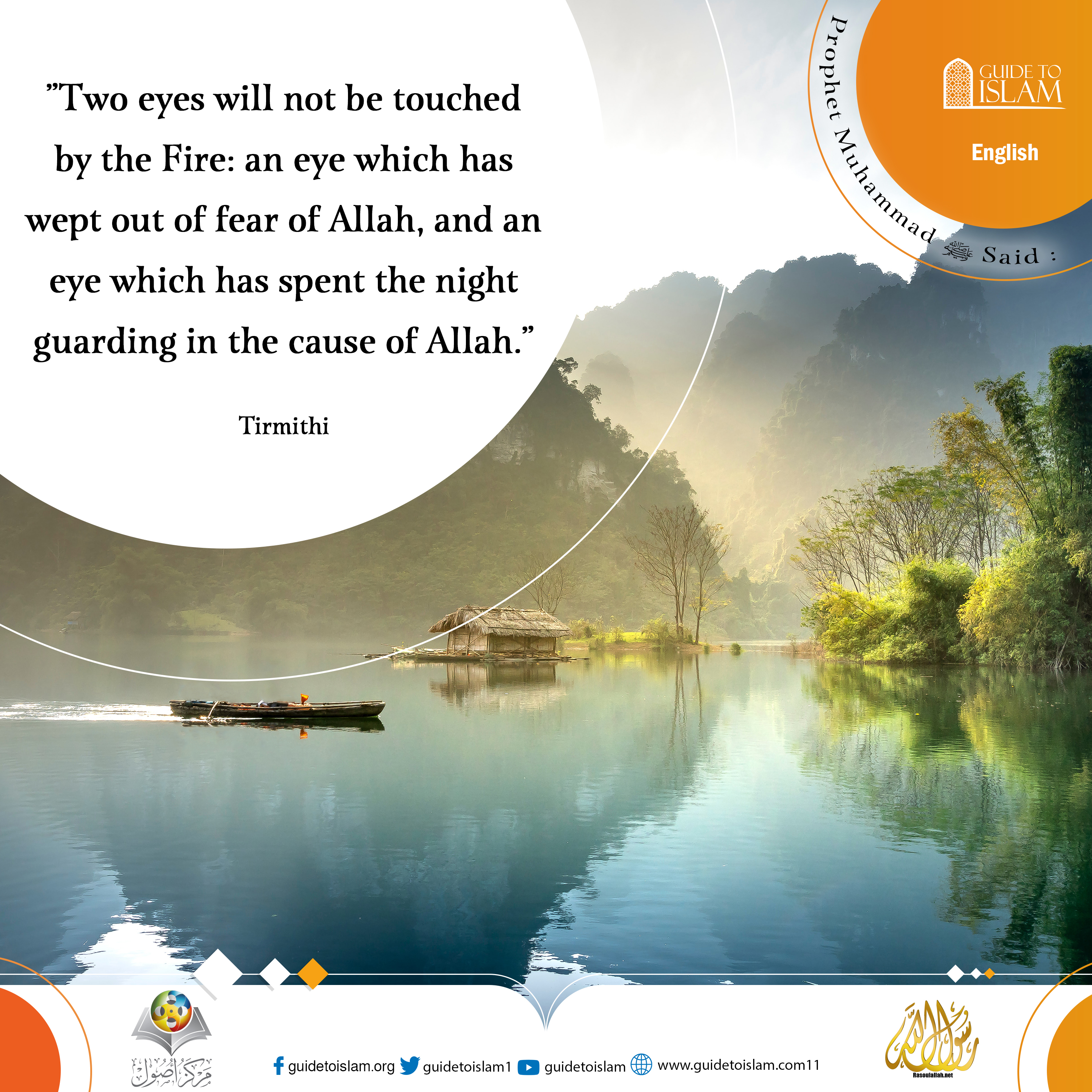 Ibn ‘Abbās (may Allah be pleased with him) reported that the Prophet (may Allah's peace and blessings be upon him) said: "Two eyes will not be touched by the Fire: an eye which has wept out of fear of Allah, and an eye which has spent the night guarding in the cause of Allah." [At-Tirmidhi].